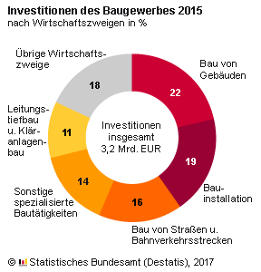 Die Investitionen in Sachanlagen haben sich gegenüber dem Jahr 2014 insbesondere im sonstigen Ausbau (zum Beispiel Malerei und Glaserei) mit einem Plus von 17,6 % auf 234 Millionen Euro erhöht. Einen deutlichen Anstieg gab es jeweils auch im sonstigen Tiefbau (zum Beispiel Wasserbau) mit + 14,5 % auf 197 Millionen Euro und im Wirtschaftszweig Bau von Gebäuden mit + 9,4 % auf 689 Millionen Euro.