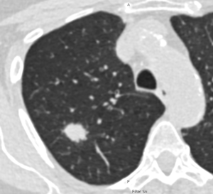Image: Low-dose CT scan of the lungs of a 69-year-old female smoker. The white, rounded area in the lung tissue indicates early-stage lung cancer. At this stage, lung cancer is still highly treatable. © Charité | Jens Vogel-Claussen