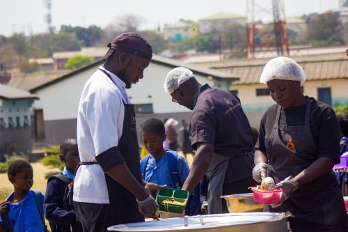 Chefs serving food to school children at Mambilima Primary School in in Lusaka’s Matero township. Photo: Annie Zulu, bird story agency